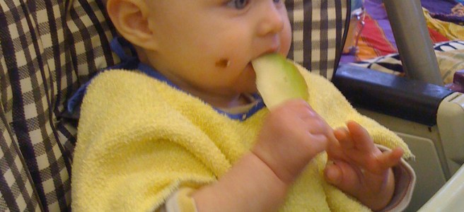 First, in case you haven’t heard this term before, let me translate. Baby-led weaning is a way to introduce solid foods to babies. Basically instead of mashing or pureeing food, you just cut it into large pieces and allow them to gum it/suck on it. Eventually they learn to take bites, chew and swallow the food. There are lots of sites to Google, if you want more information about this.